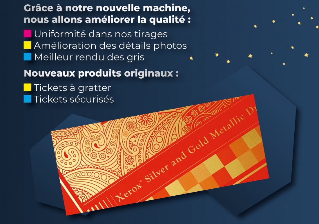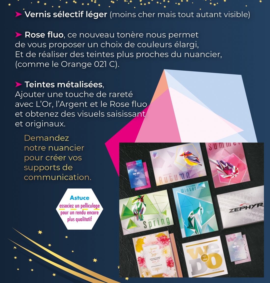 En 2022 on vous fait briller ! Rose fluo sur bleu marine Noir sur fond Argenté Or sur Blanc Couleurs fluo sur Noir Exemple d'utilisation du Rose fluo Lettrage Noir sur fond Argenté Argenté sur papier rouge Blanc et Or sur fond Argenté Photo Argenté Impression Blanche sur papier kraft Or et Rose fluo Impression Or et Noir sur calque Rendu supérieur sur papier créatif texturé Aperçu de teintes réalisables grâce au Rose fluo Teintes inatteignables en CMJN Teintes inatteignables en CMJN LES ACTUALITÉS ARCHIVÉES DU NOUVEAU CHEZ PÉGASE IMPRIMEUR ! UTILISEZ LES SUPPORTS MAGNÉTIQUES ! PÉGASE IMPRIMEUR CONTINUE SA CROISSANCE ! RENOUVELLEMENT DU LABEL IMPRIM'VERT ELECTIONS MUNICIPALES 2020 PASSEZ AU GRAND FORMAT ! BOOSTEZ VOS ASSOCIATIONS UNE DYNAMIQUE MAINTENUE DEVENEZ CRÉATIF AVEC VOTRE NOUVELLE CARTE DE VOEUX TRAITEURS/BOULANGERS PRÉPAREZ AU MIEUX VOS FÊTES VALORISEZ VOTRE ENTREPRISE. CEST LA FIN DE L'ANNÉE LA NOUVELLE TECHNOLOGIE "QUALITÉ-RAPIDITÉ"
